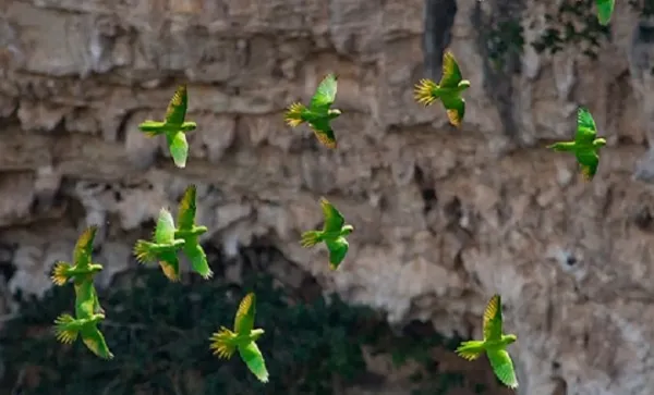 The Sima de las Cotorras is an impressive natural formation located in the state of Chiapas, Mexico. It is a huge sinkhole over a hundred meters deep, surrounded by lush vegetation. Its name comes from the numerous green parrots that inhabit its interior, which offer a unique spectacle at dawn and dusk as they fly in and out in flocks. In addition to its scenic value, the place is important for its ecological richness and for the cave paintings found on its walls, testimony to ancient cultures.